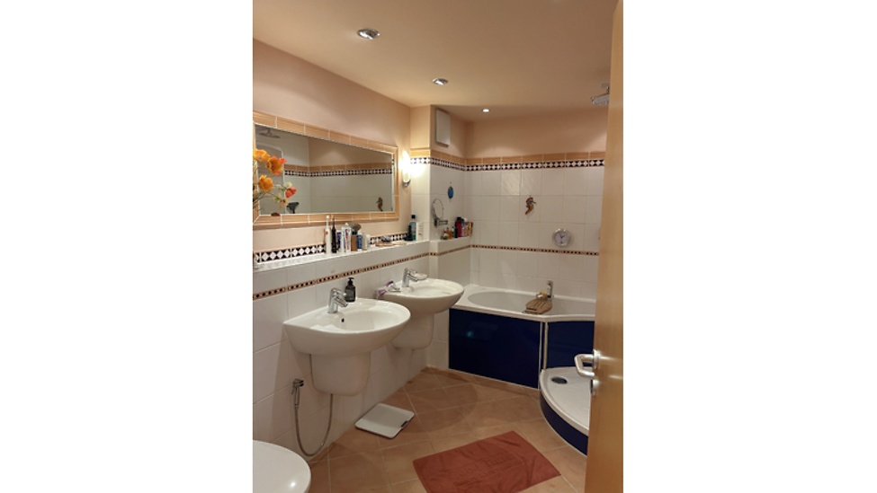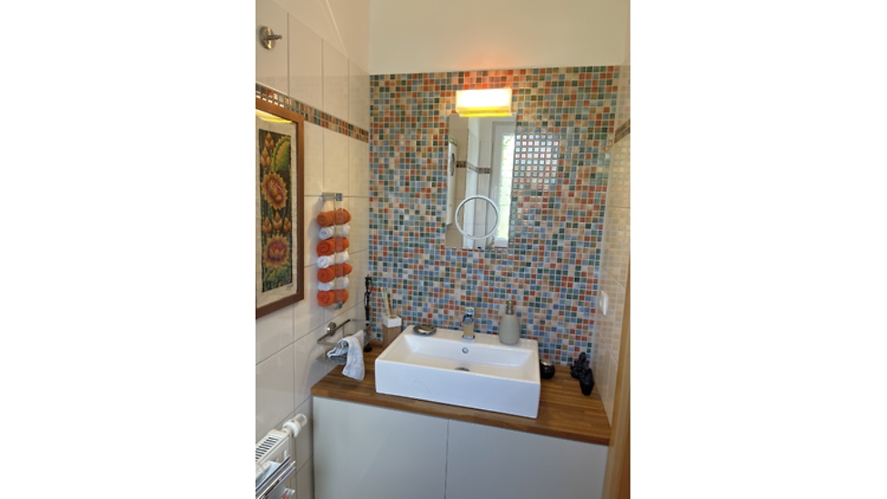 The bathroom has a fold-away shower wall, bidet shower, floor heating