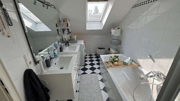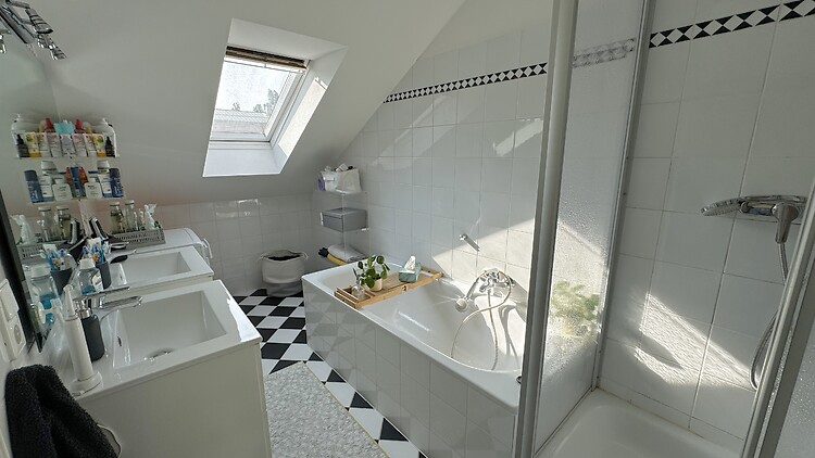 There is a shower, a bathtub, 2 washbasins and a separate WC